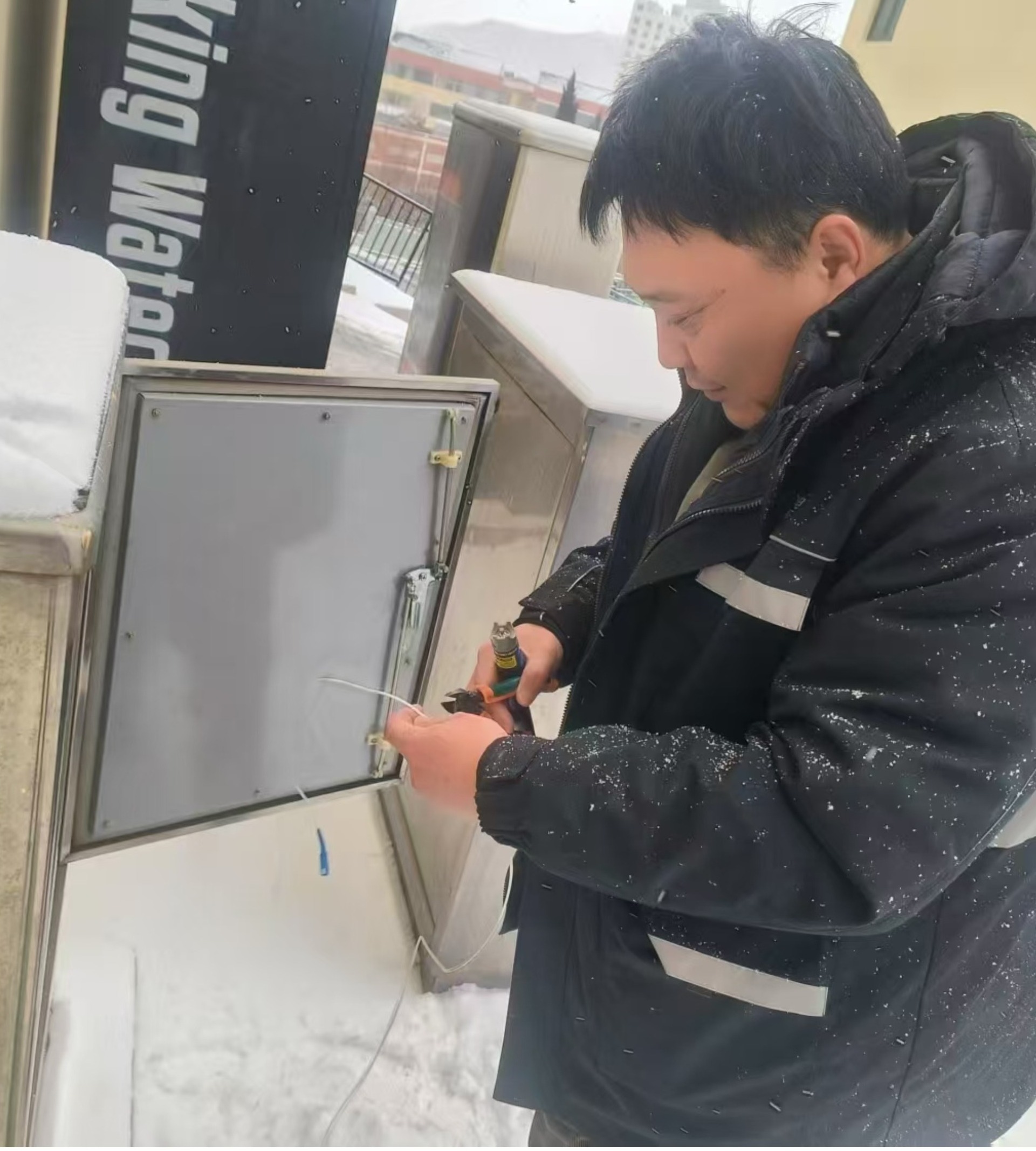寒潮來(lái)襲,日照莒縣分公司始終堅(jiān)持客戶(hù)至上的服務(wù)理念,客戶(hù)經(jīng)理接到報(bào)修電話(huà),第一時(shí)間趕到現(xiàn)場(chǎng),進(jìn)行故障排查、信號(hào)恢復(fù),保障客戶(hù)收視與上網(wǎng)體驗(yàn)。圖為莒縣分公司直屬營(yíng)業(yè)部客戶(hù)經(jīng)理王寶昊在桃園北區(qū)處理信號(hào)故障。